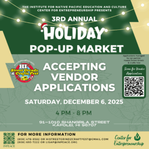 In partnership with HI Street Grindz & Crafts Festival, please join us for our 3rd annual Holiday Pop-Up Market! This is a FREE community event. Bring the whole ʻohana to shop local, and enjoy ʻono food and exciting entertainment. This is an in-person event.