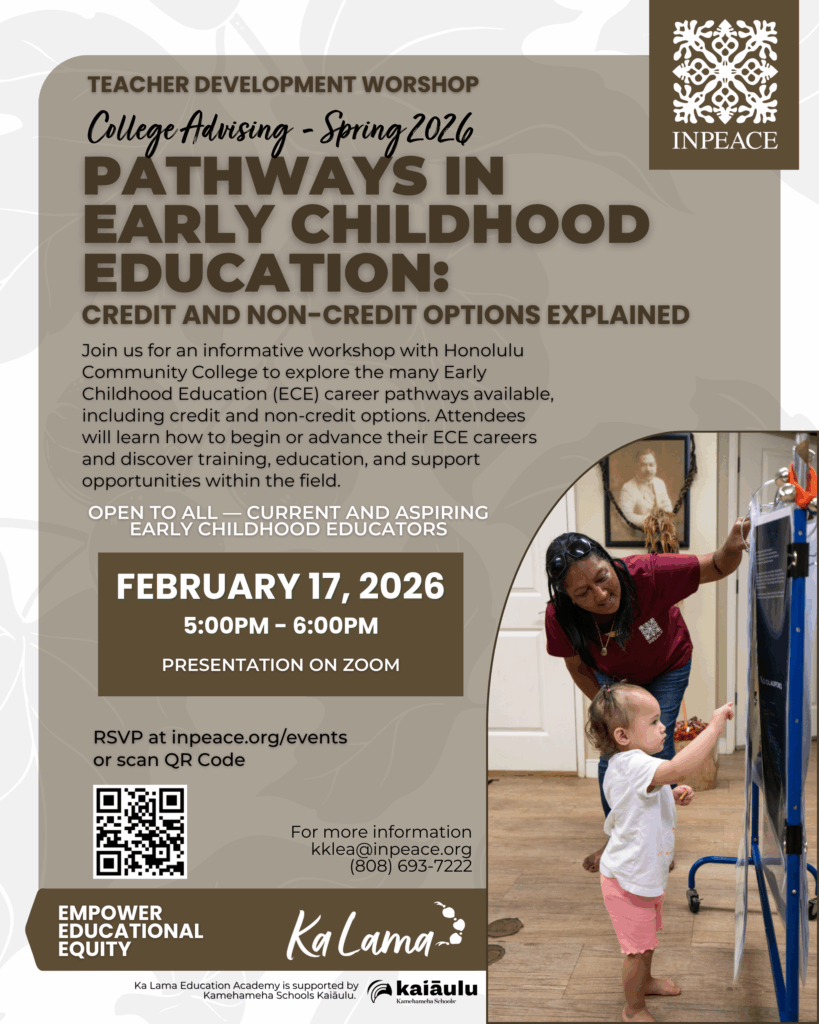 This workshop is a collaboration between Ka Lama and Honolulu Community College. Participants will learn how to begin or advance a career in early childhood education -whether they are current Ka Lama participants, educators, students or community members interested in working with Hawaii’s keiki. The workshop will highlight how education, training, and community-based support can connect to meaningful career opportunities in the ECE field.