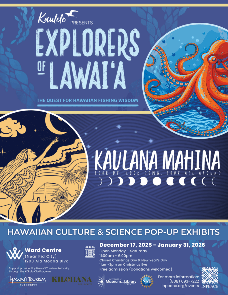 Join us from December 17 – January 31 for Kaulele at Ward Centre introducing our newest exhibit Explorers of Lawaiʻa and also featuring the Kaulana Mahina: Look Up, Look Down, Look All Around exhibit.