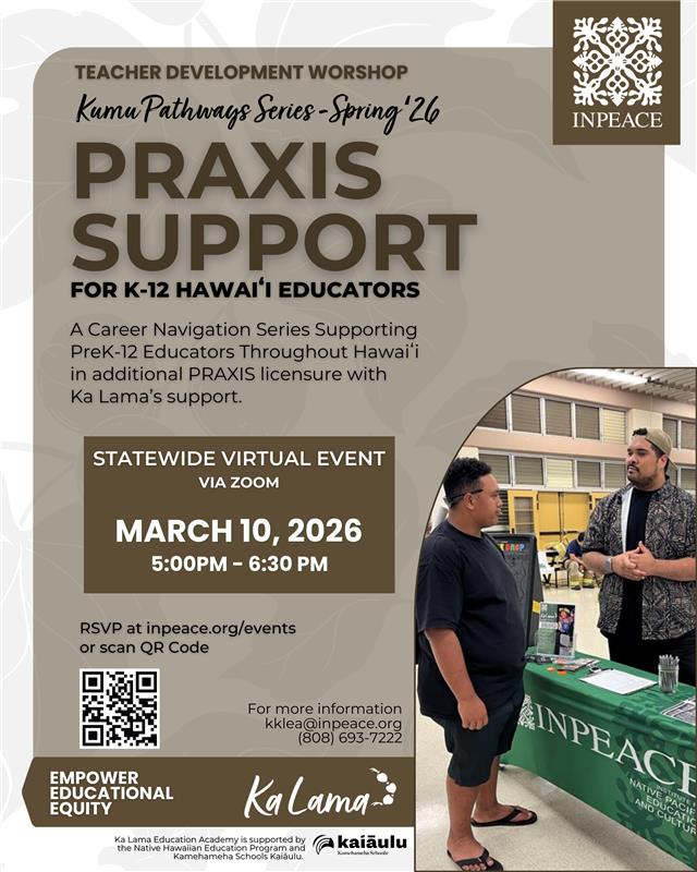 PreK-12 educators will learn information about the process for securing PRAXIS during teacher license training, gain knowledge of requirements (pre/post licensure), learn about different partners in the licensing process (Hawaii Teachers Standard Board – HTSB, Educational Testing Service – ETS, SATEP programs, etc.) as well as how to add a teaching field (STEM, SPED, ECE, etc.) with Ka Lama supports.